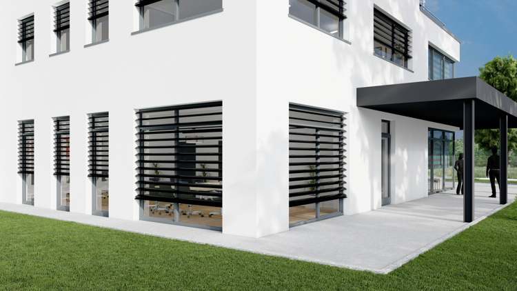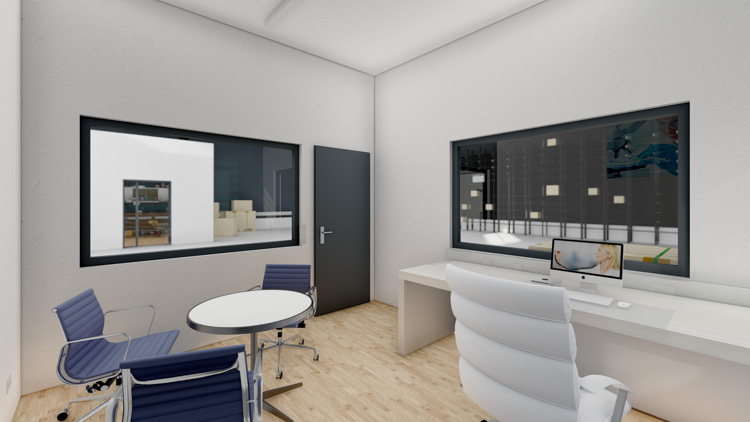 Das Bürogebäude nimmt im Erdgeschoss den Empfangsbereich sowie moderne Schulungsräume auf. Im 1. Obergeschoss befindet sich ein lichtdurchflutetes Großraumbüro mit Rückzugsbereichen für konzentriertes Arbeiten. Das Herzstück bildet das Reallabor „Green Health Lab“ im 2. Obergeschoss: Als Versuchslabor für Forschungszwecke bietet dieser Bereich realitätsnahe Muster- und Patientenzimmer. Hier können vor Feldversuchen in Einrichtungen wie Krankenhäusern, Pflegeheimen oder Hospizen praxisnahe Studien, Fallbeispiele und Erprobungen durchgeführt werden.