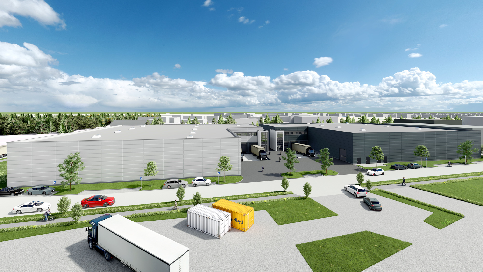 Die Be- und Entladung der Güter erfolgt über Sektionaltore an den Vorderseiten der Gebäude. Elektrohydraulische Überladebrücken sorgen für einen sicheren und flexiblen Niveauausgleich und ermöglichen den effizienten Einsatz von Flurfördergeräten. Disposition, Dokumentation und Abrechnung aller Leistungen sind zentral in den Büros im Obergeschoss organisiert – für kurze Wege und effiziente Abläufe im gesamten Komplex.