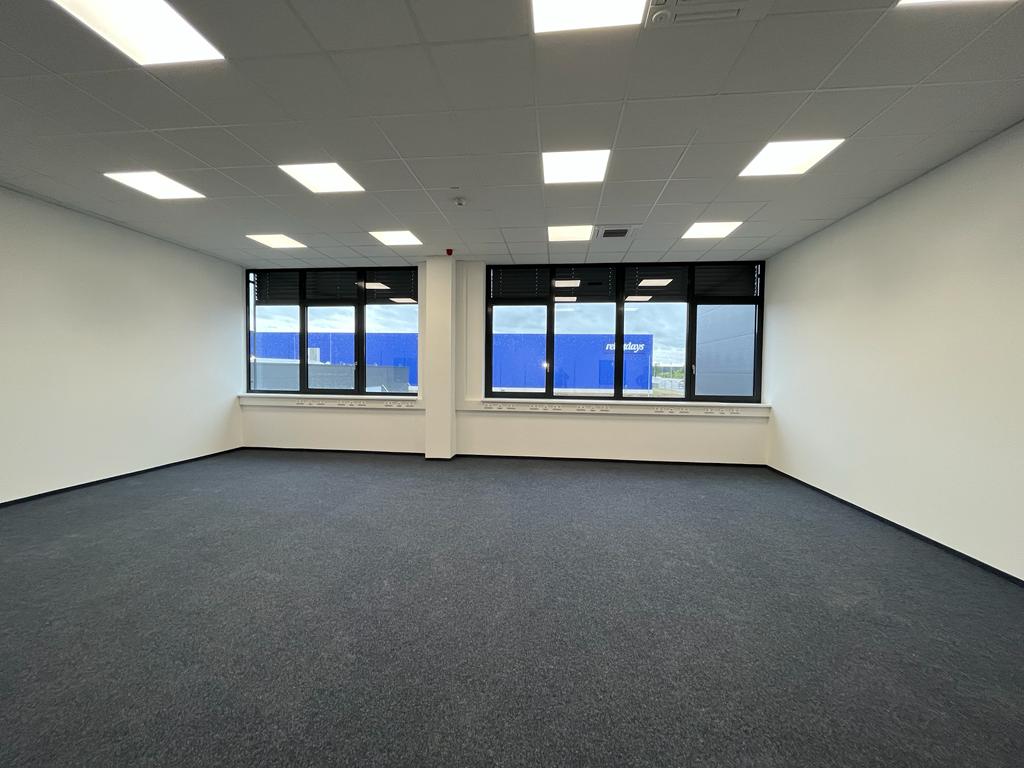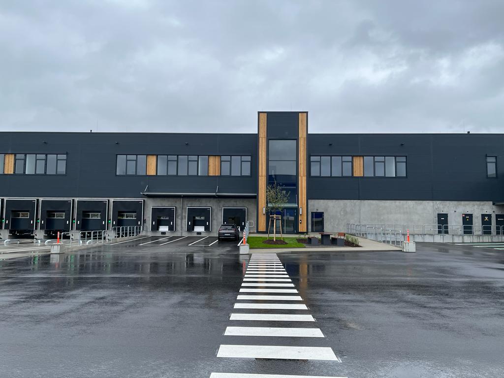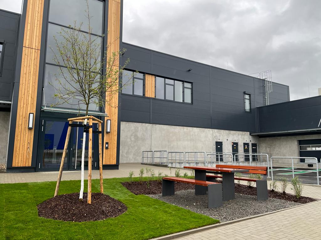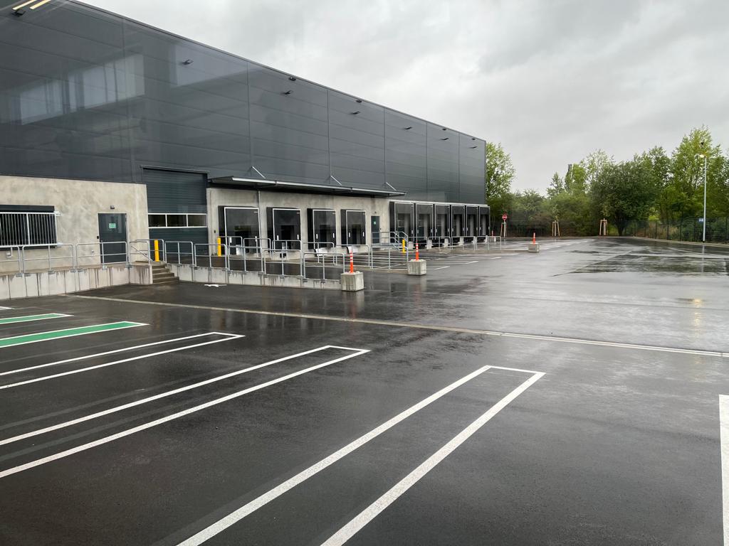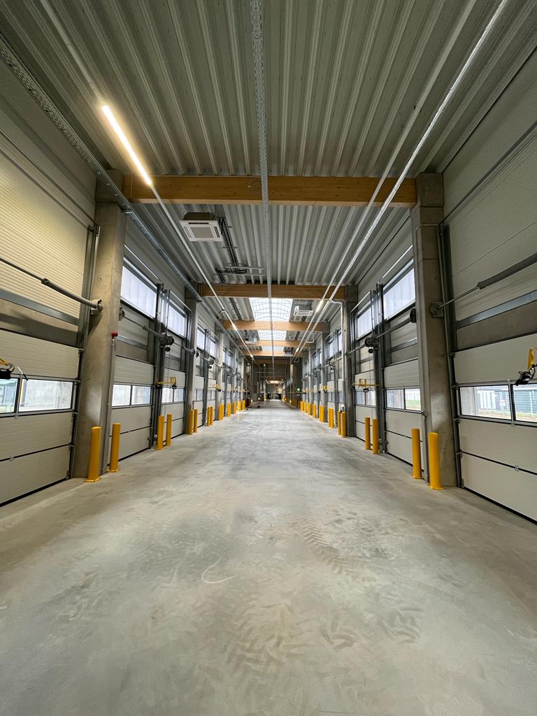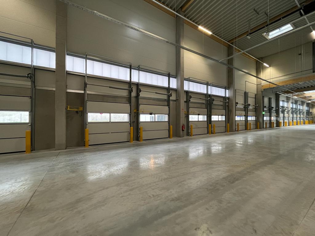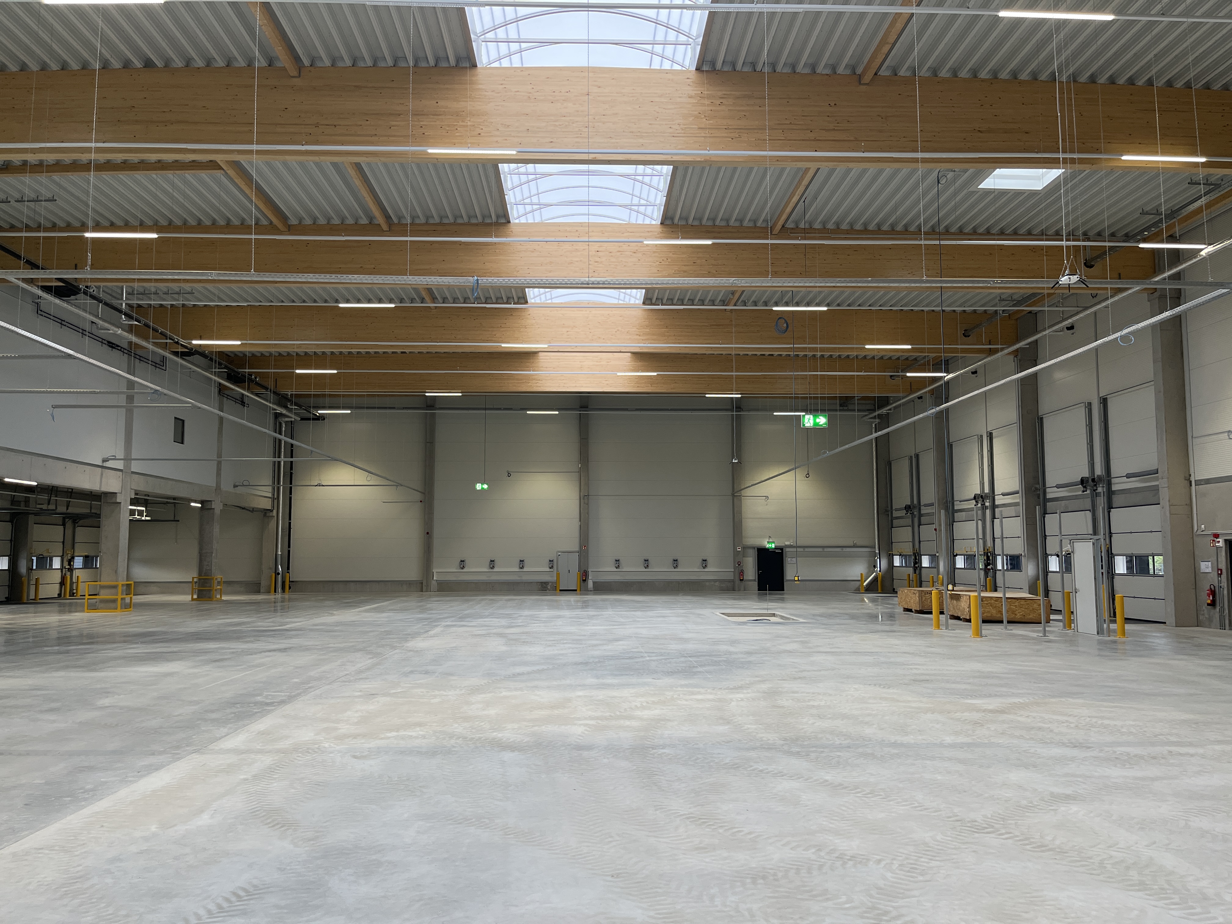 Zur Ausstattung gehören zwölf Überladebrücken, 63 Sektionaltore sowie ein als Empore gestalteter Büroraum. Die Außenanlagen umfassen asphaltierte Fahrwege, Betonhöfe vor den Toren und betonierte Lkw-Stellplätze. Die Beheizung der Halle und des Büros erfolgt über effiziente Wärmepumpen. Für die Beleuchtung setzen wir im Innen- und Außenbereich auf moderne, energiesparende LED-Technik. Zusätzlich wurden die baulichen Voraussetzungen für eine auftraggeberseitige PV-Anlage geschaffen. Im Außenbereich sorgen Nistkästen für Vögel und Fledermäuse für einen Beitrag zum Naturschutz.